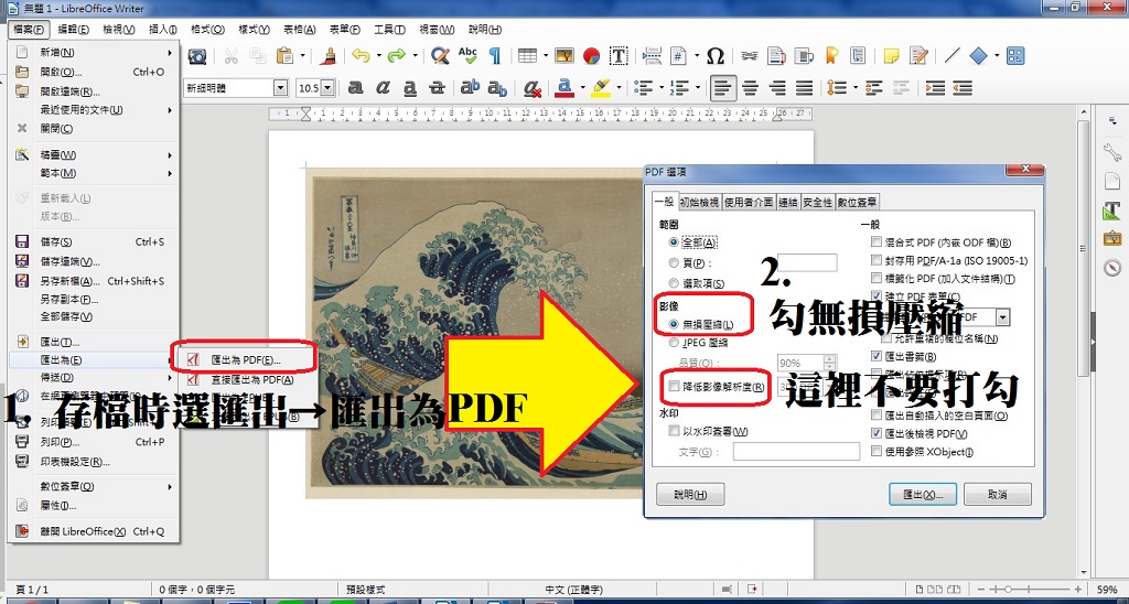 使用LibreOffice,在存成PDF時,請將選項的「影像」選成「無損壓縮」,同時「降低影像解析度」的方格不要打勾,