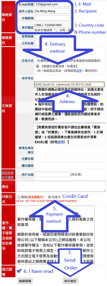 - 收件人姓名:請填寫英文姓名以便寄送
