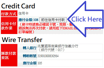 - 網站僅接受1.信用卡線上刷卡(會增加2.5%代收金流處理費)2.台灣本地銀行帳戶的匯款付款。不接受Paypal、支付寶等其他支付方式。