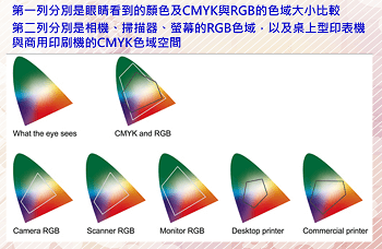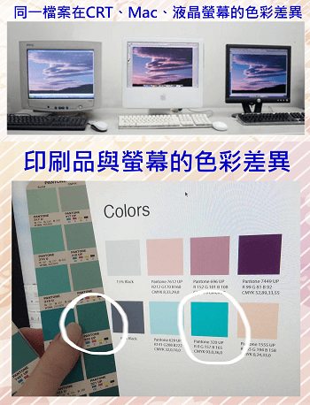 - 不同螢幕的顯像能力、色彩基準都不同,再加上一般螢幕比較少做色彩校正,因此在不同螢幕上看到的顏色就有可能不一樣。螢幕上看到由RGB組成的顏色與印刷由CMYK組成的顏色更會不一樣。