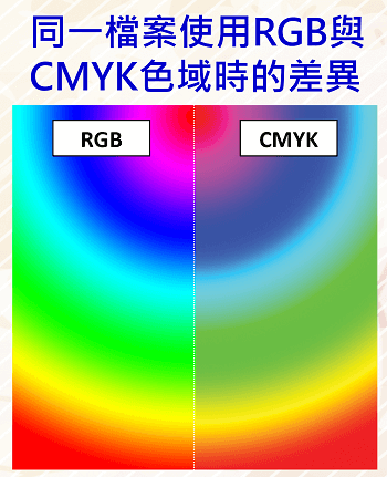 - 除了螢幕與印刷分別使用RGB及CMYK呈現顏色外,檔案本身也可以依照不同目的分別使用RGB或CMYK色域,純粹用來在螢幕上看的檔案多會存成RGB色域。檔案如果要用在印刷上則建議轉換為CMYK色域,這樣會讓螢幕上看到的顏色與印刷成品更接近一些(但仍會有不同)。