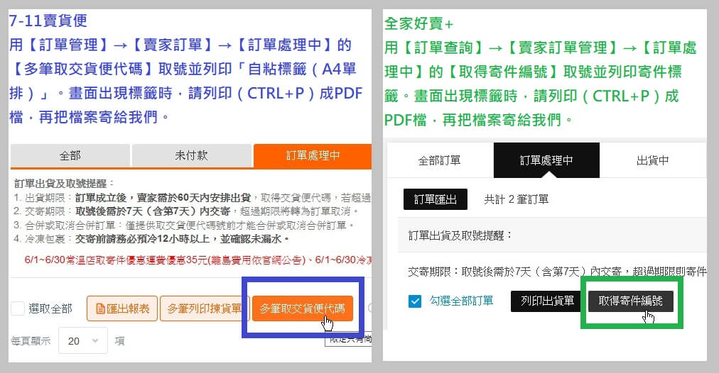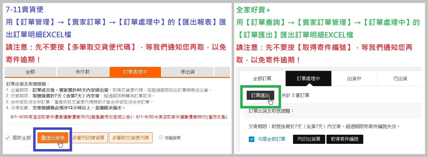 1、請先在「7-ELEVEN賣貨便」及全家「好賣+」後台將訂單明細EXCEL檔匯出。