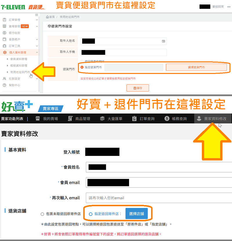 7、提醒您:寄給讀者的書有時因各種原因沒人取件,會需要退回到您方便收件的門市。因此請您務必利用「賣貨便」或「好賣+」的後台(如下圖)做設定。