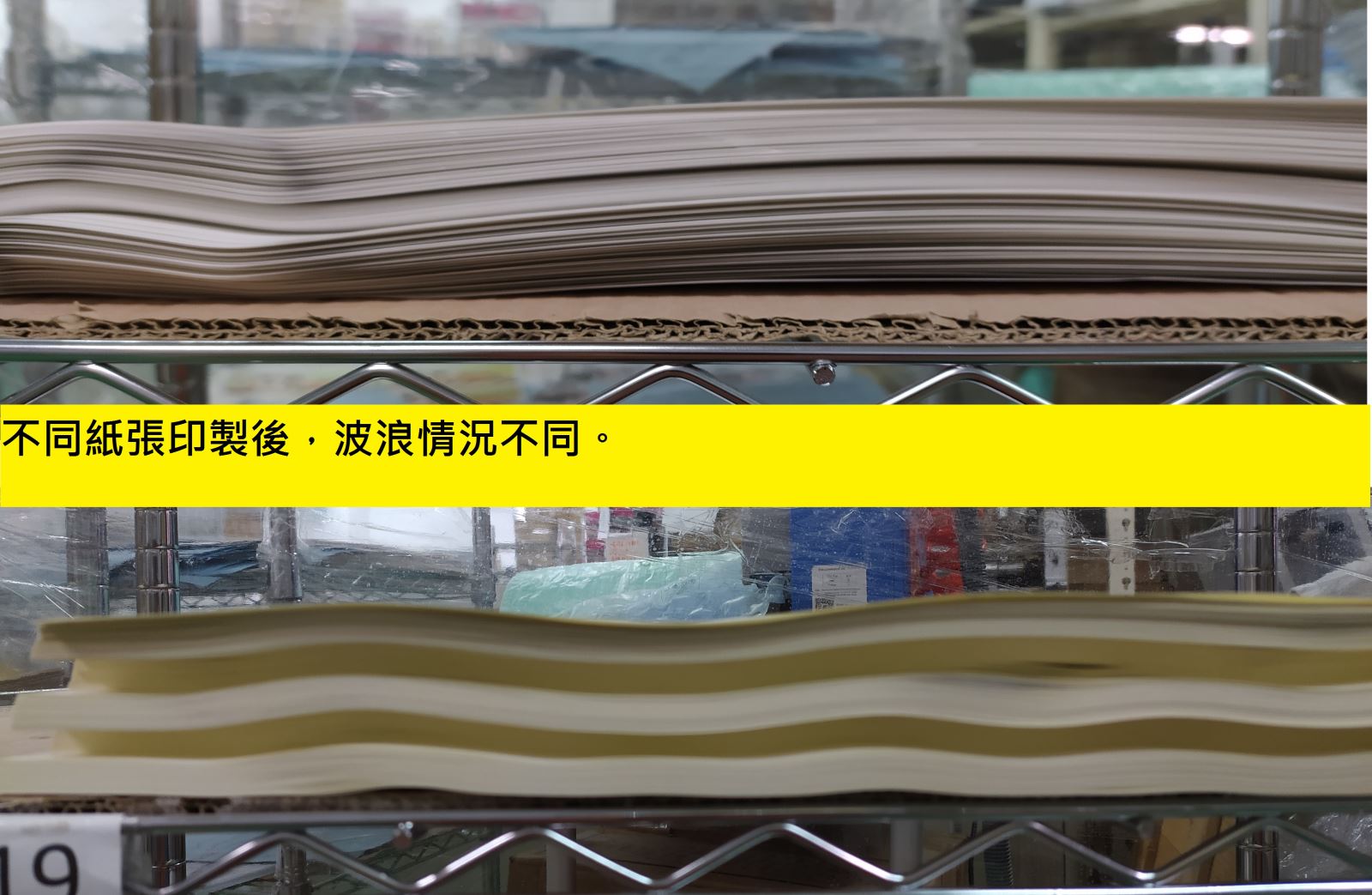 尤其為嵩高紙因磅數較輕,經過印製加熱後也會較為波浪捲曲,可以參考附圖為我們剛印製出來的不同紙張,其波浪情況也是不同。