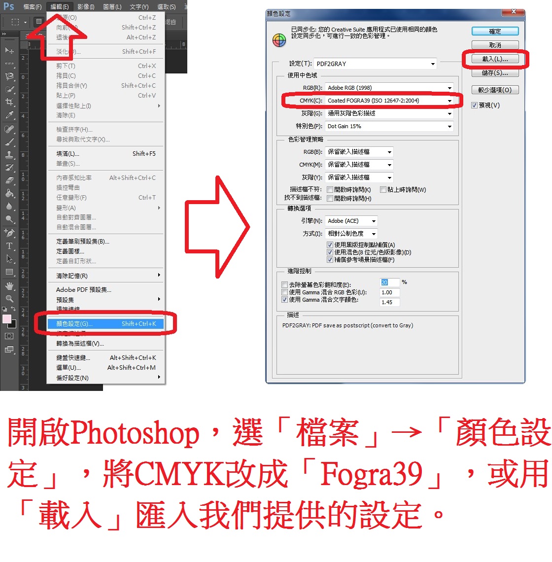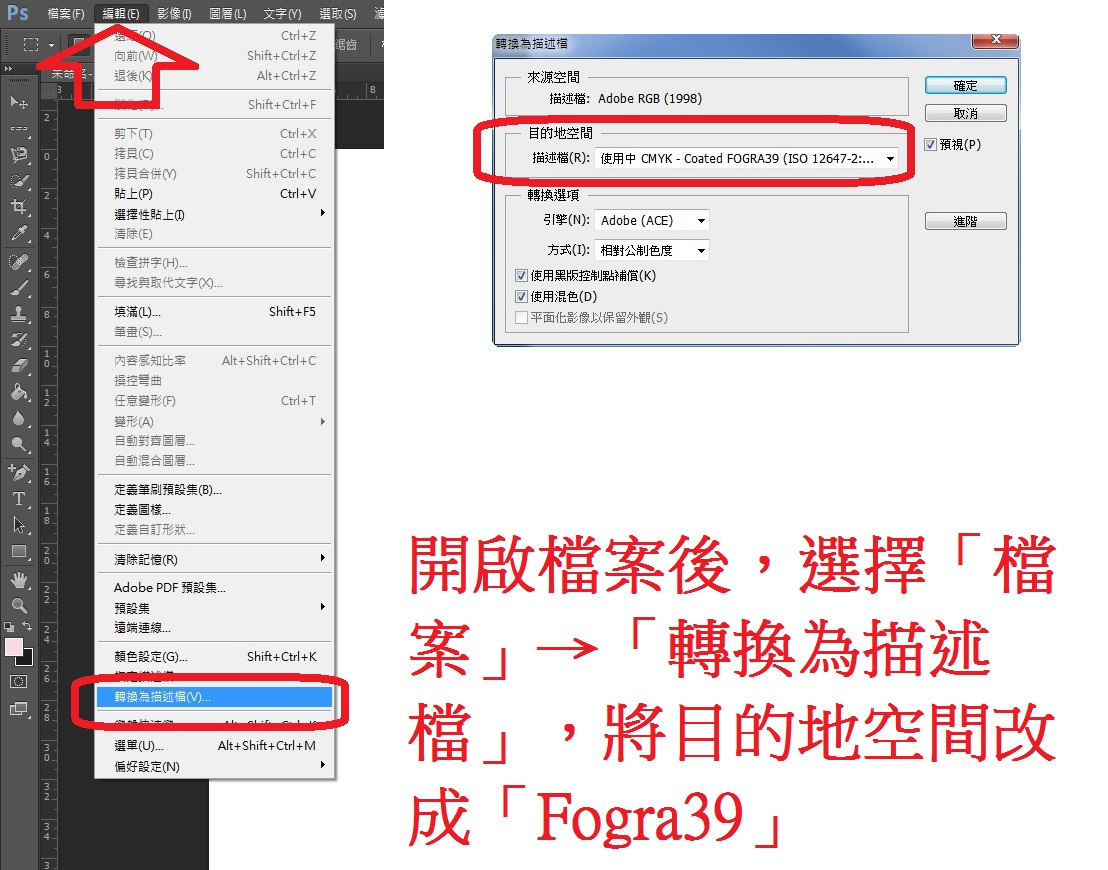 如何將檔案改成「CMYK色域+Fogra 39 ICC」模式?以下以Photoshop為例: