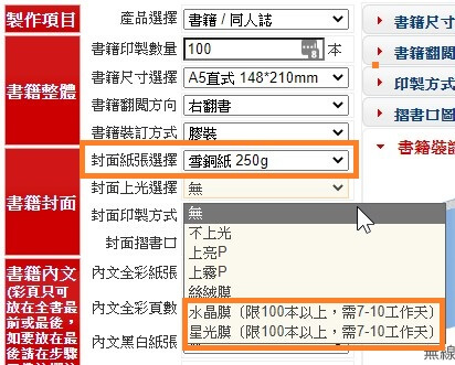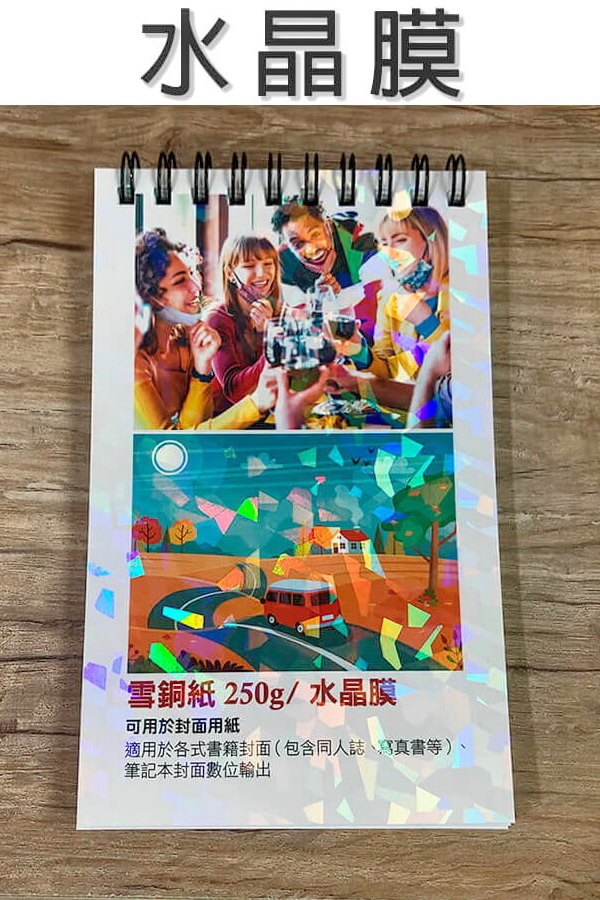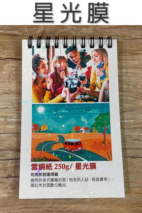 下單時,只要封面紙張選擇「雪銅紙250g」,上膜選項就會有「星光膜」、「水晶膜」可以選。