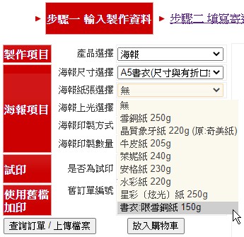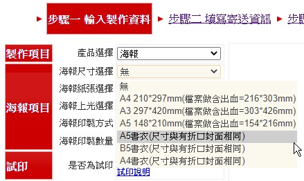 (1)產品選擇選「海報」,有A5、B5、A4書衣可選。
