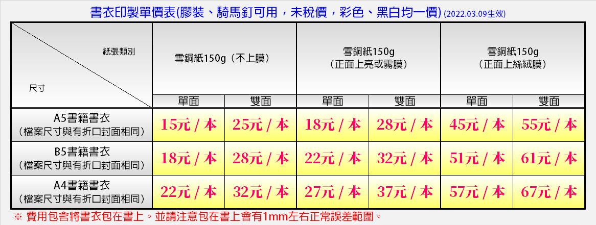 1. 如須送印書衣,紙張限用150g雪銅,可上亮、霧、絲絨膜。
