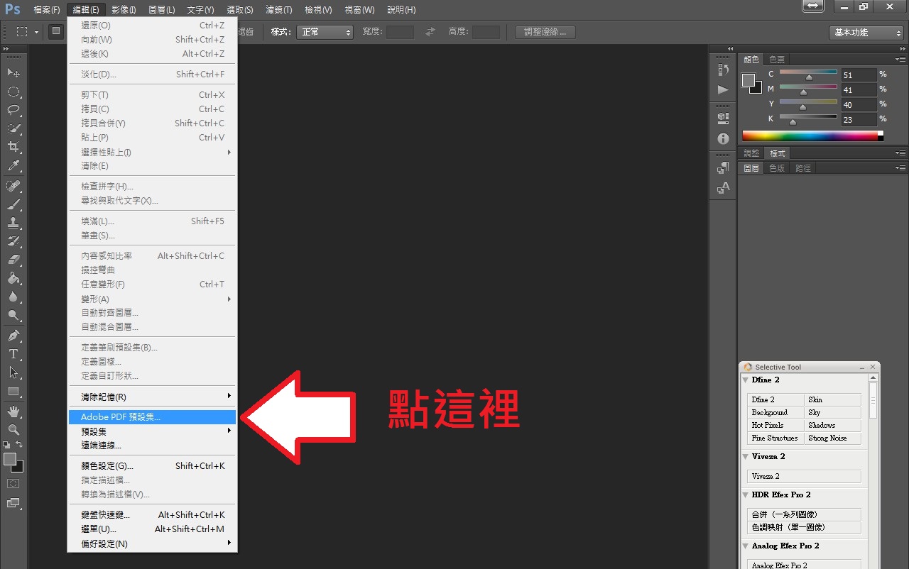 1. 先開啟Photoshop,選「編輯」-「Adobe PDF預設集」