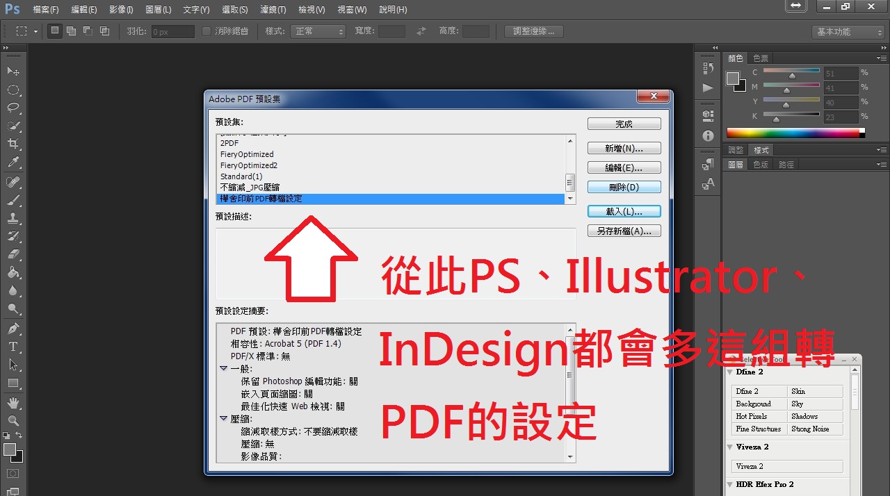 4. 載入後,PS、Illustrator、InDesign都會多了一個「樺舍印前PDF轉檔設定」