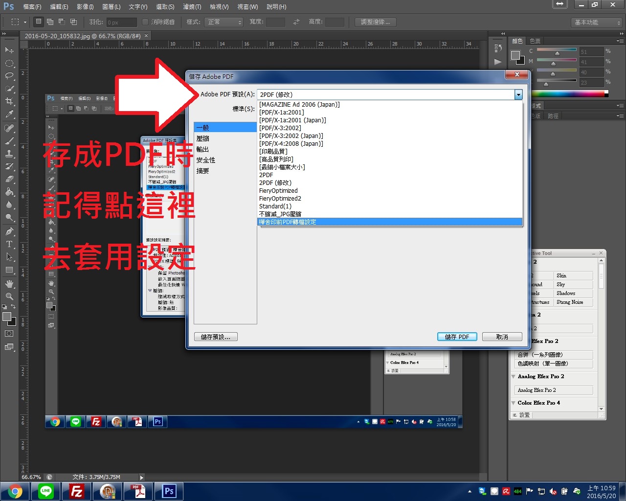 5. 以後要存檔時,把「Adobe PDF預設」改成這個設定,就可以套用