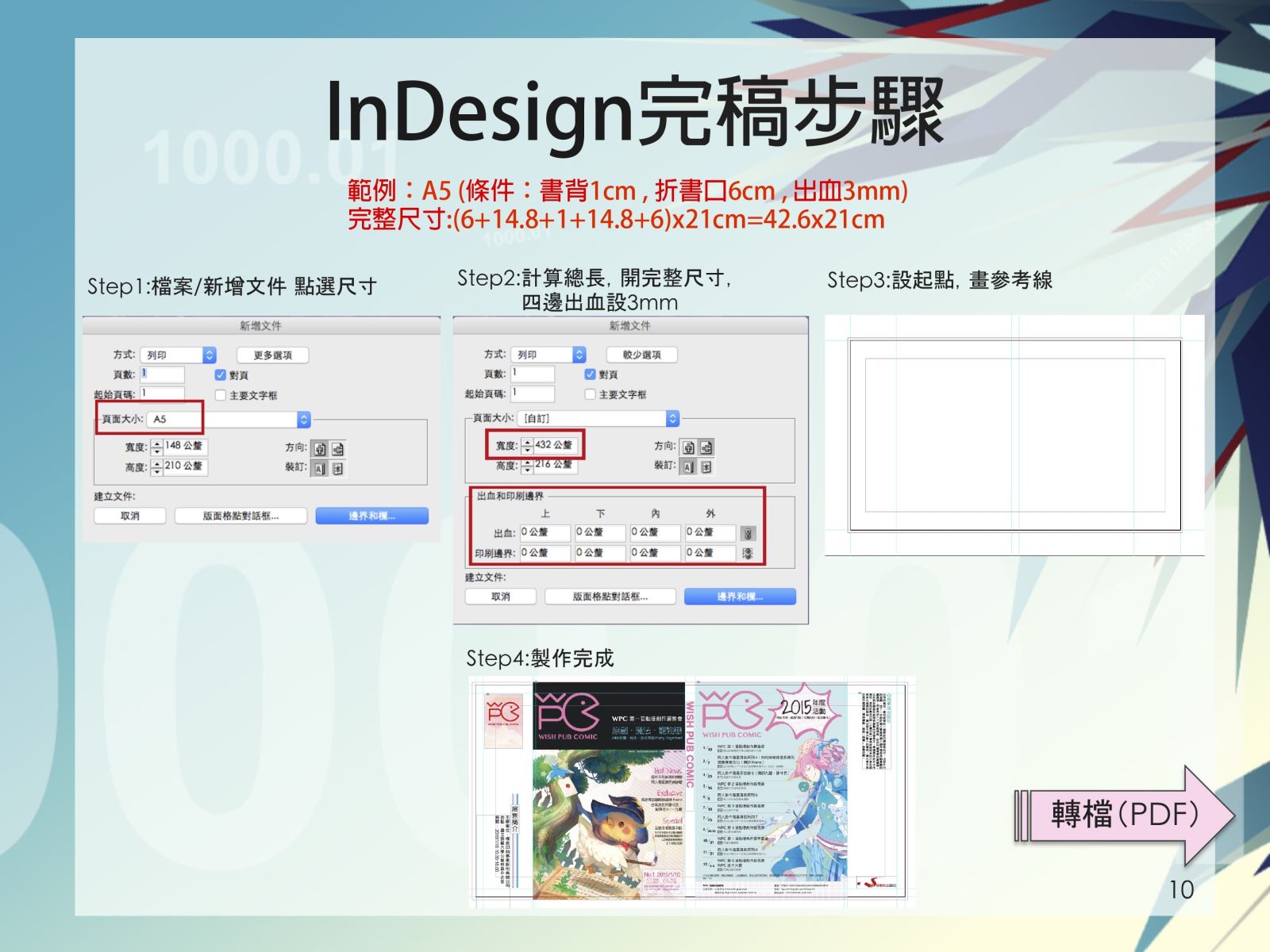 製作軟體使用的是Adobe/InDesign,尺寸就以第4頁上方所開的A5為範例。建議您先計算出總長度之後再key in進去,出血選項輸入上下內外各3mm。開啟頁面之後,用參考線來標示出折書口 、書背等位置,再放入您要的素材。