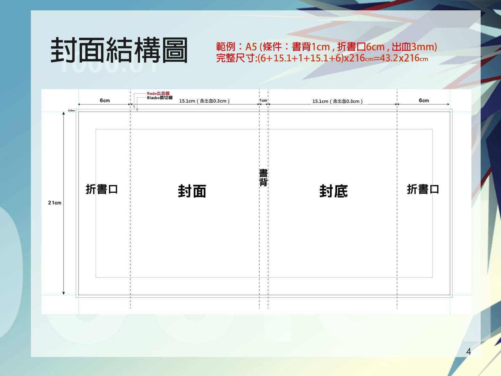 接著帶大家認識封面結構圖。我們是以A5(148x210mm),且有書背及折書口為範例。黑色的線就是裁切線(也就是所謂的完成尺寸):42.6x21cm ;出血線就是指外圍的紅線(四邊各0.3cm)也就是說最後完成的檔案尺寸必須包含出血:(42.6+0.6)x(21+0.6)cm=43.2×21.6cm。