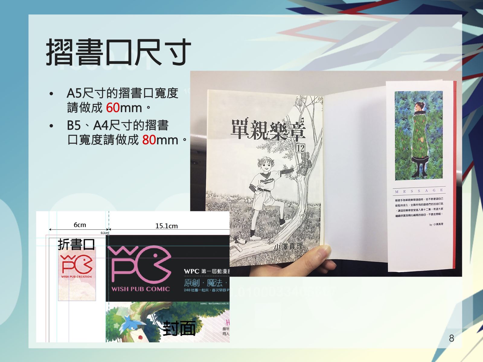 假設要做折書口的話,封面連接折書口的兩側,會至少多0.3cm到折書口上(如附圖:封面紅色的部份有延伸到折書口)就是為了讓封面不要有露白邊現象產生。